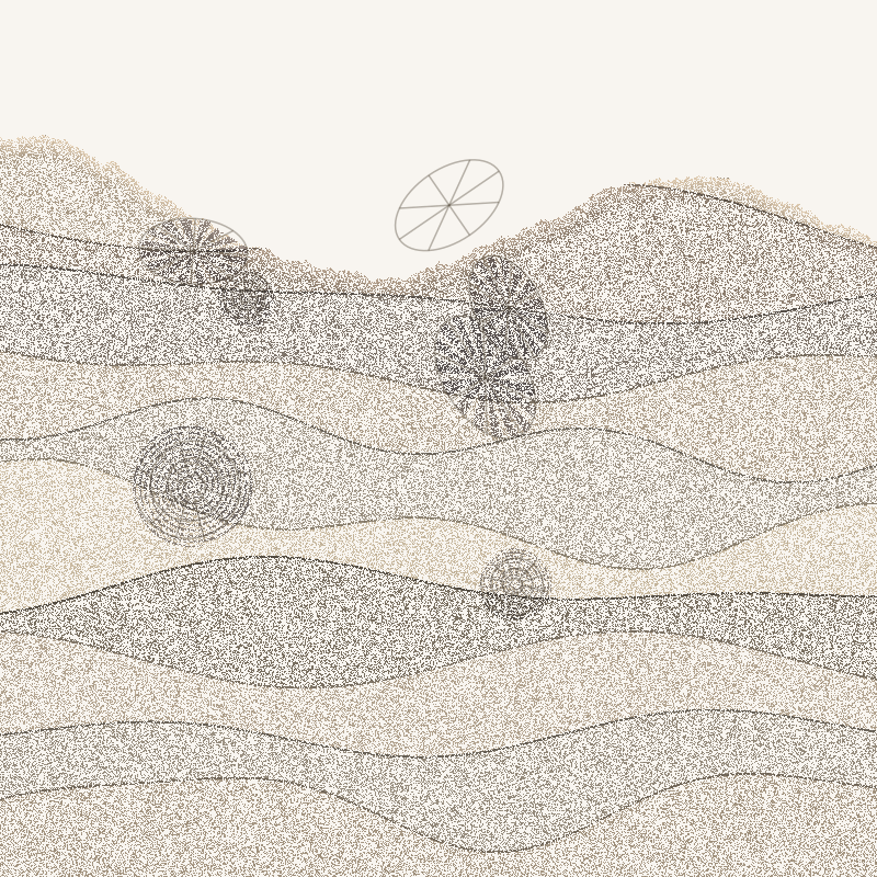 The stippled texture continues — chalk on sandstone. Each seed produces a different arrangement of fossils, different undulations, different depths of erosion. Some fossils sit half-exposed at the surface; others remain buried deep.