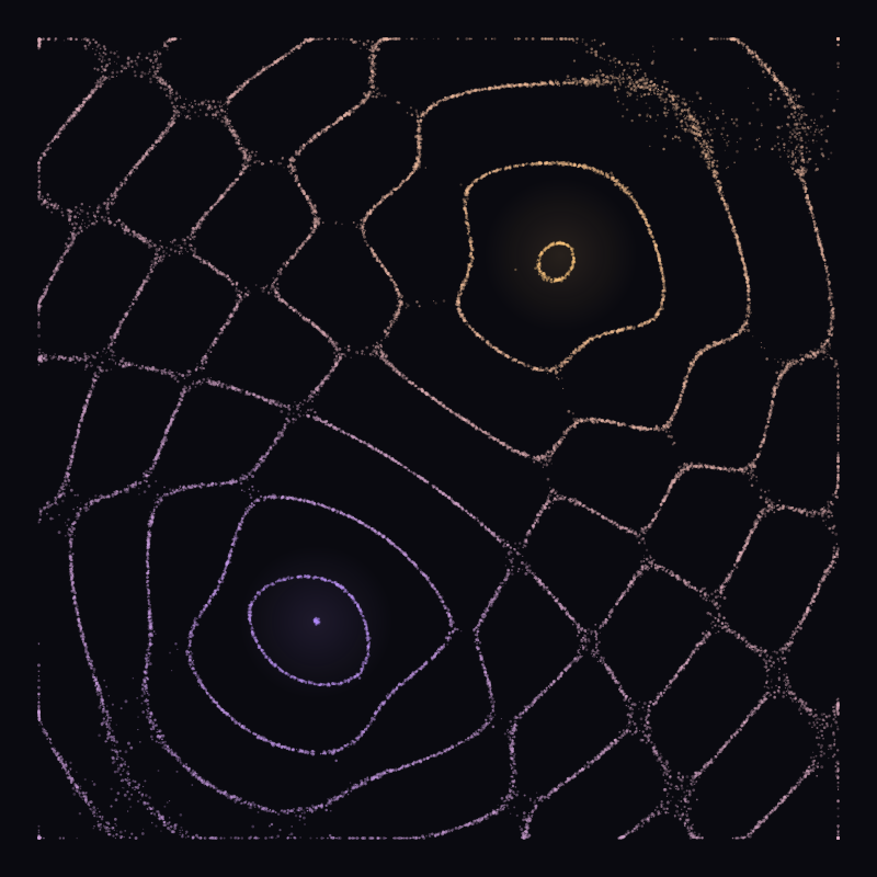 Two sources close but not aligned. Frequencies clash, then briefly align, then pull apart again.